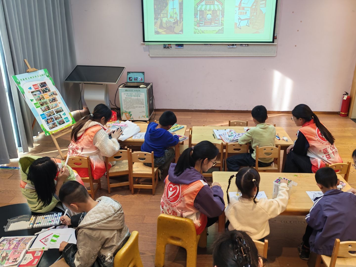 在“创意绘画”环节,孩子们化身小设计师,在画纸上勾勒心中的“我的书香小屋”:有的用书本堆叠小屋墙体,窗户外的蓝天绿茵为眼睛的放松提供合适场所;有的在书架旁描绘小熊,似乎是专心阅读的自己;还有的为小屋门前添上“玉兰树”,呼应“书香润心,似玉兰吐幽”的主题。志愿者蹲身倾听孩子们的创作理念,并为孩子们推荐相应的读物。